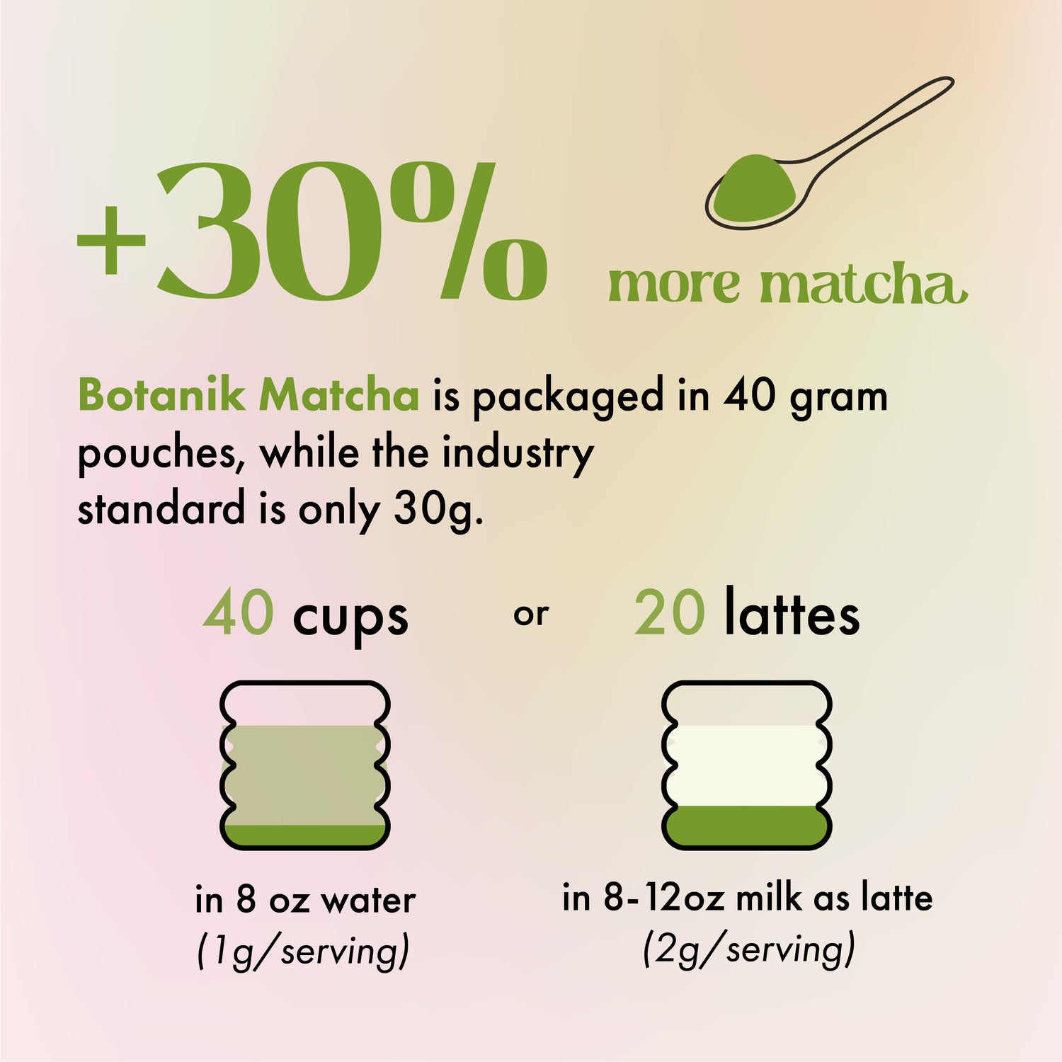 Drinking matcha everyday can get expensive. To support you, deciding to increase our standard pouch size from 30 grams to 40 grams. More matcha to fuel your mindful grind.