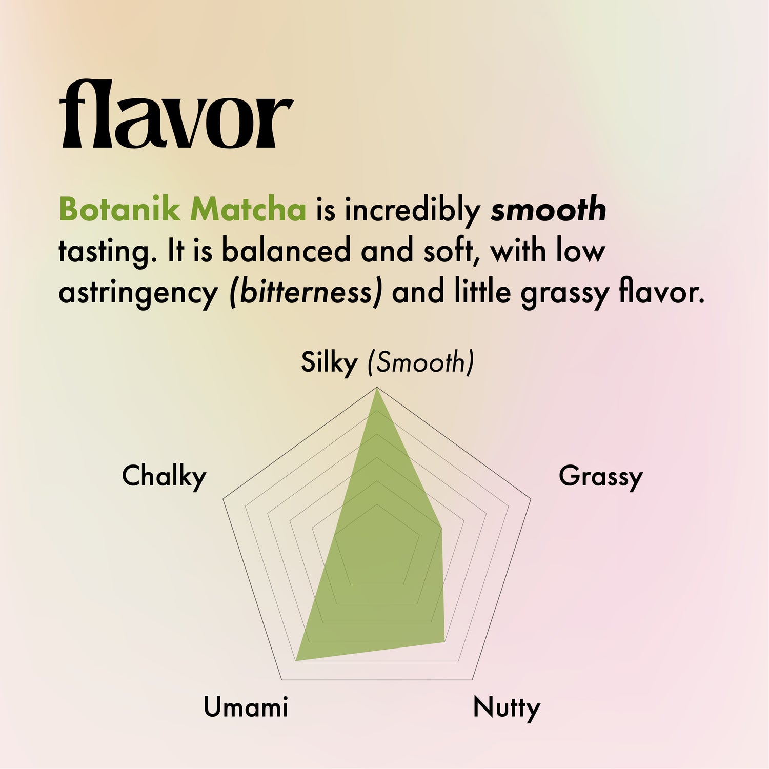 Our matcha stands out for being incredibly smooth and creamy. While most matcha is thought to be bright and grassy, Botanik Matcha is mellow and soft. It is delicious on its own or will be amazing mixed into your creative concoctions.
